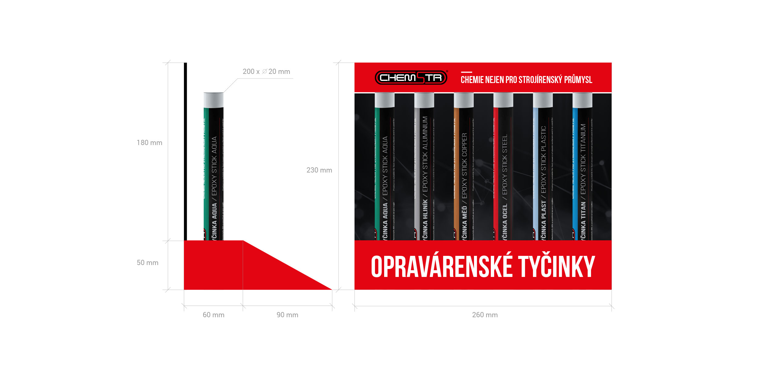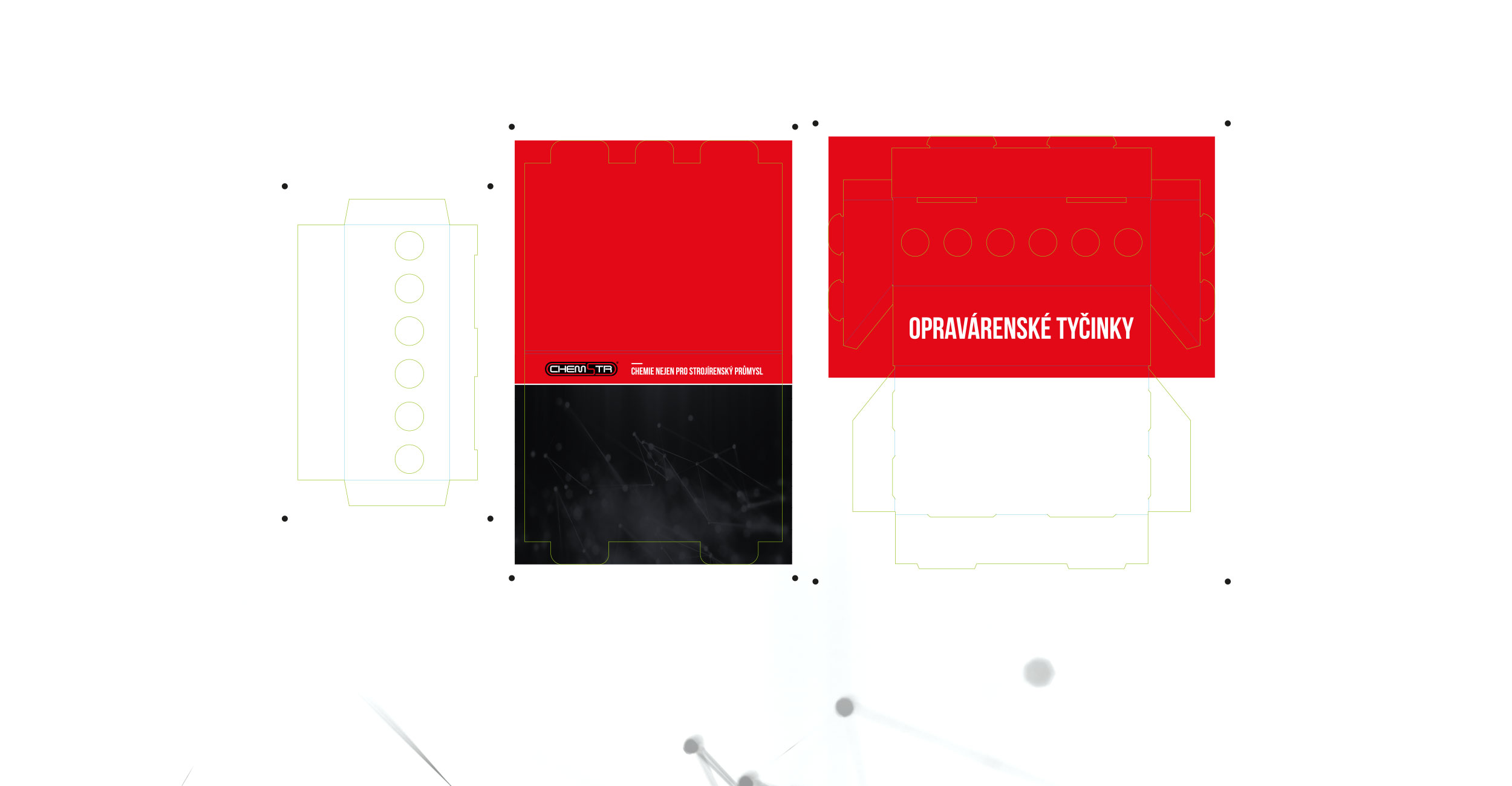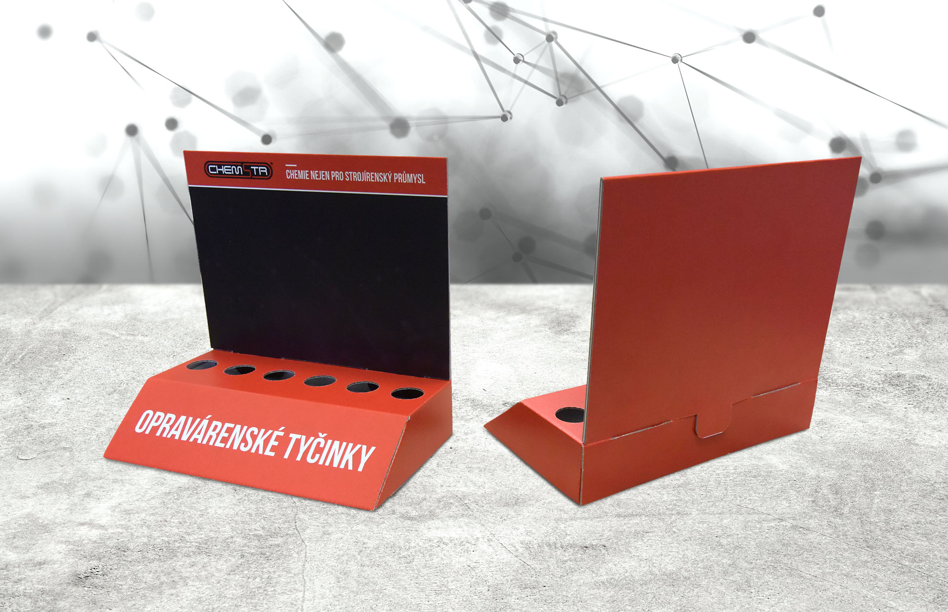 Cílem projektu pro společnost Chemstr s.r.o. zabývající se výrobou čističů, maziv, lepidel a opravárenských tičinek, bylo navrhnout design a funkční konstrukci stojánku pro sadu opravárenských tyčinek. Výsek konstrukce stojánku je zhotoven z E-vlny široce zastoupené při využití konstrukcí právě tohoto typu. Potisknuto UV tiskem.