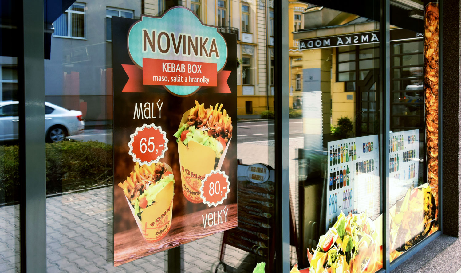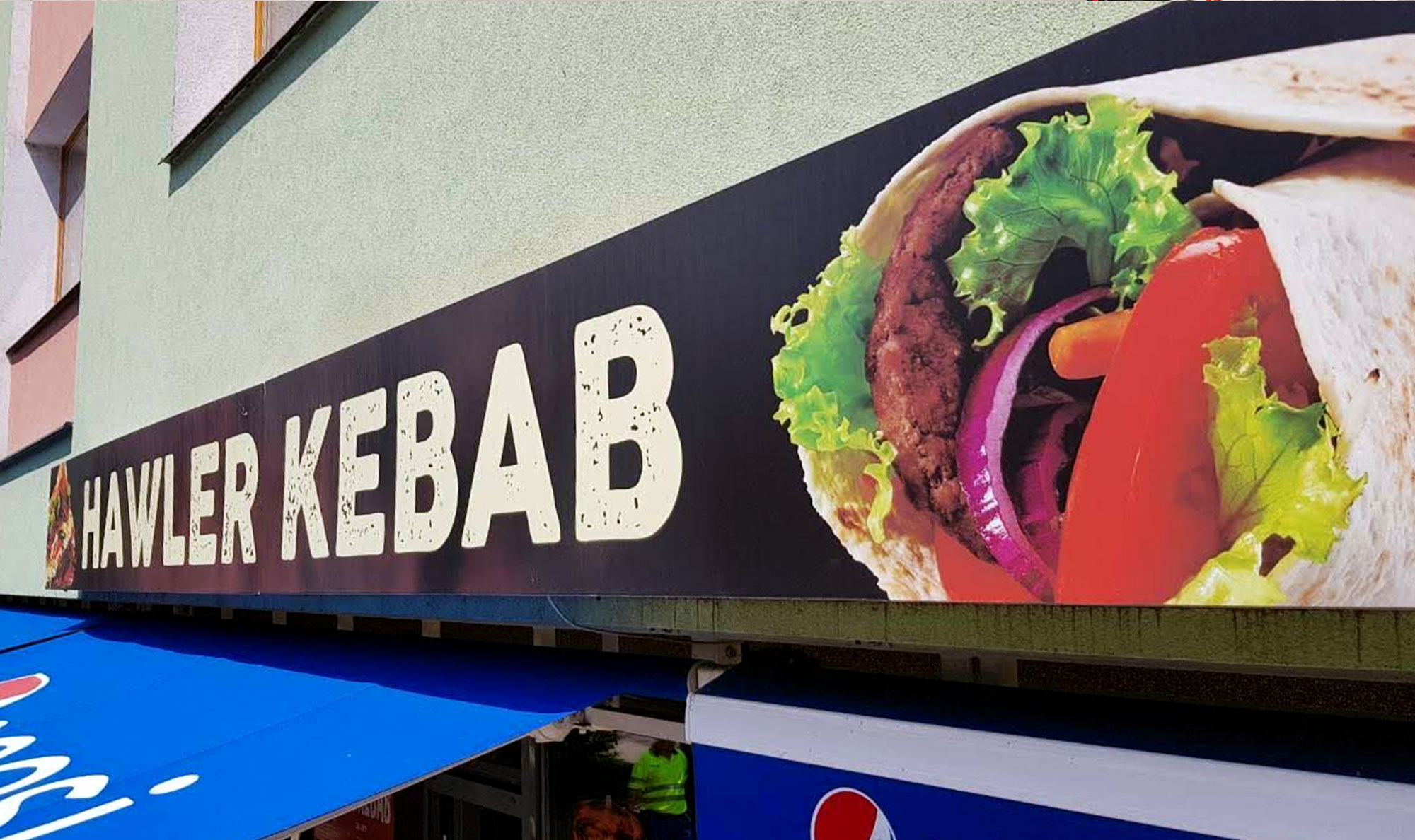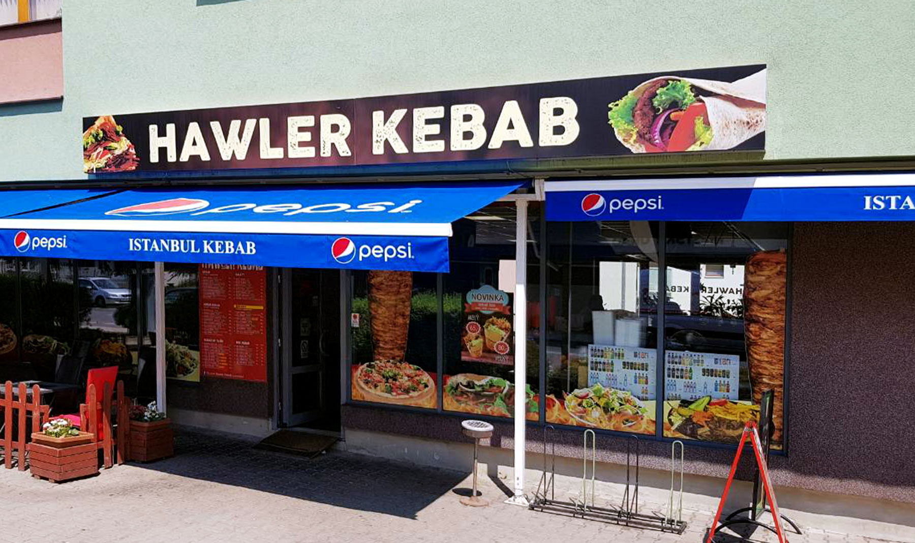 Pro označení restaurace Hawler kebab, se použil světelný box. Součástí instalace byla samolapka na výlohu informující o novince v nabídce.